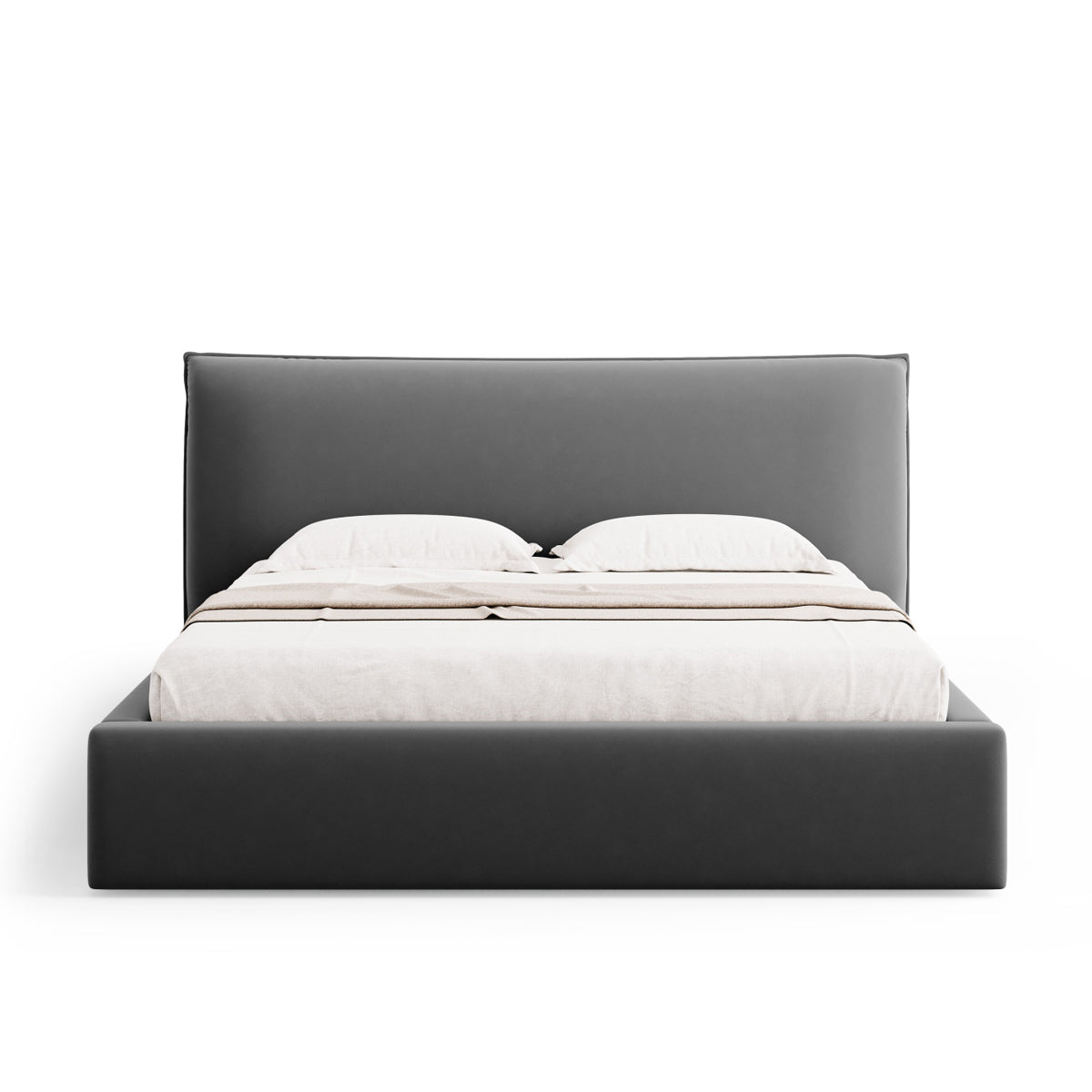 Pat tapițat în catifea gri închis, cu tăblie și ladă de depozitare.