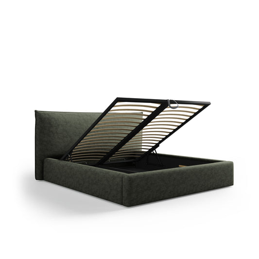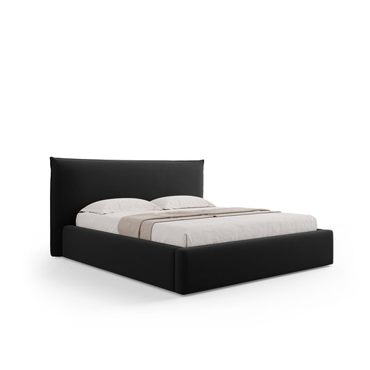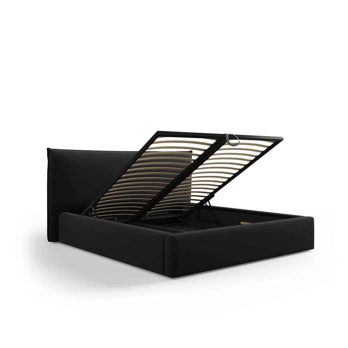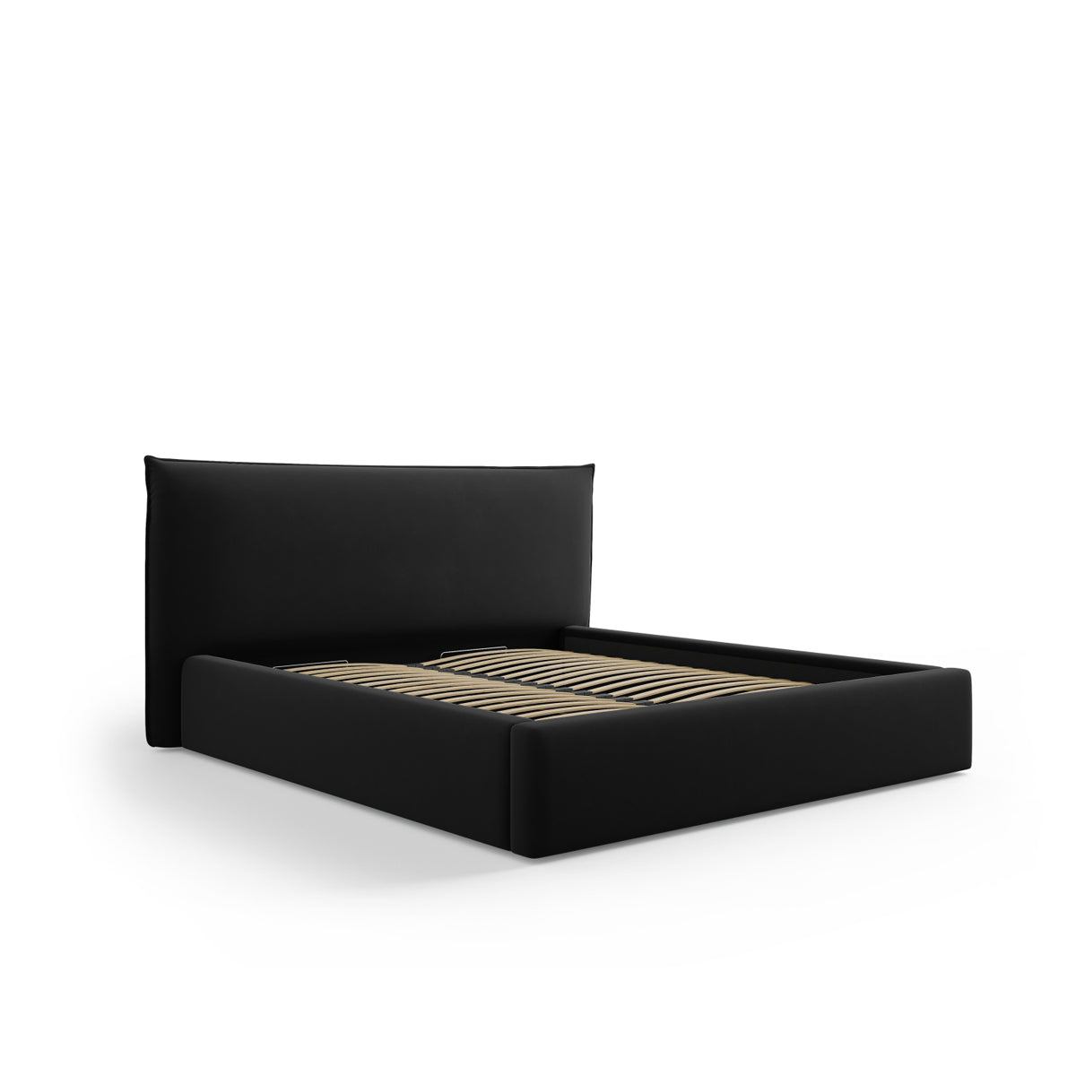 Pat tapițat în catifea neagră, cu tăblie și ladă de depozitare.