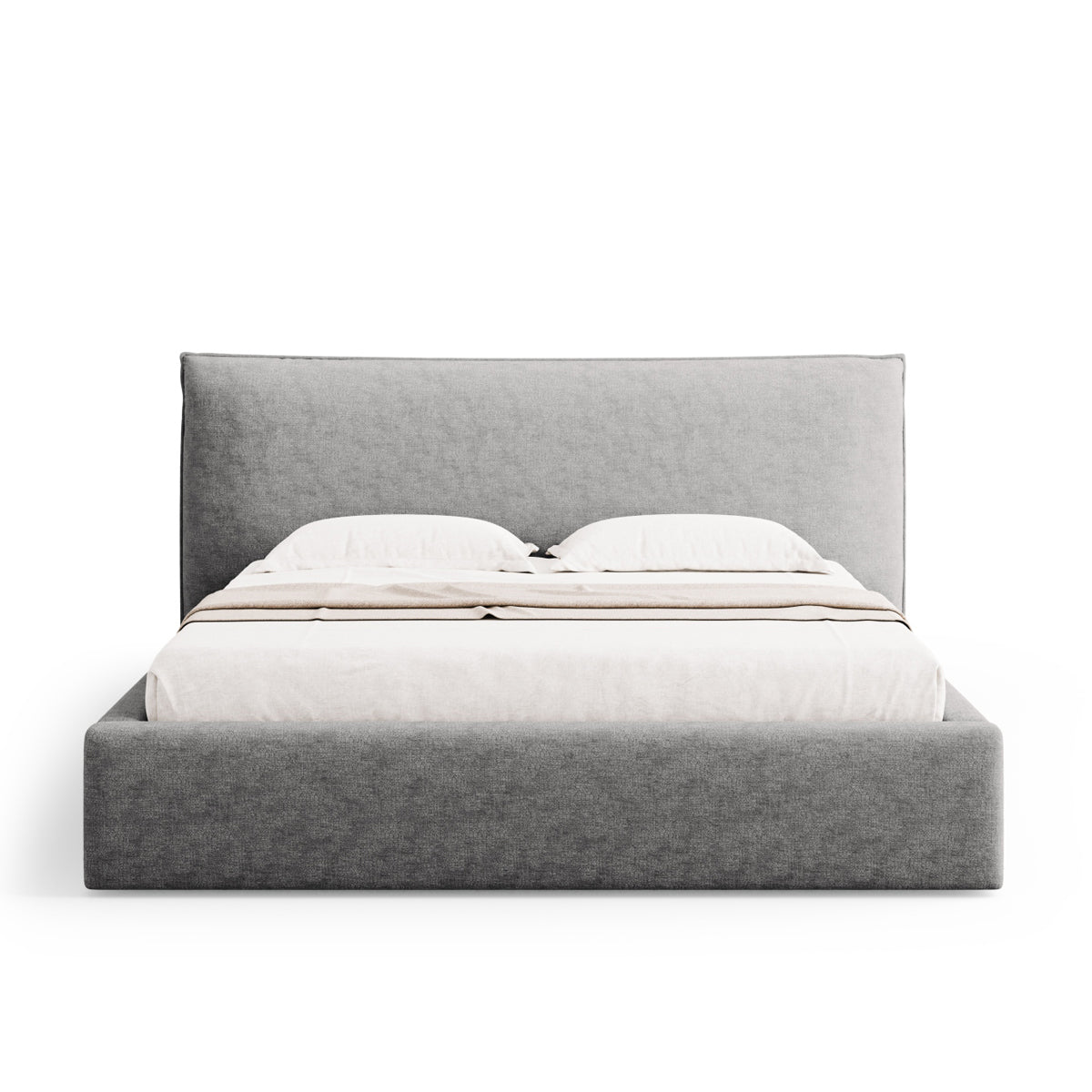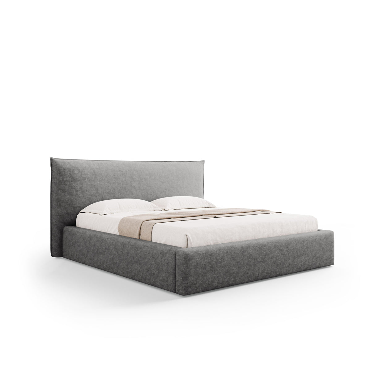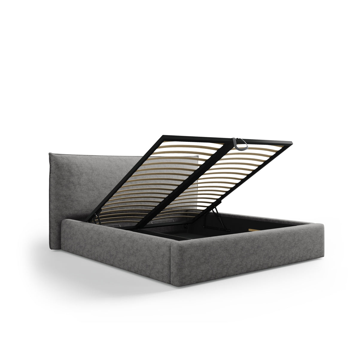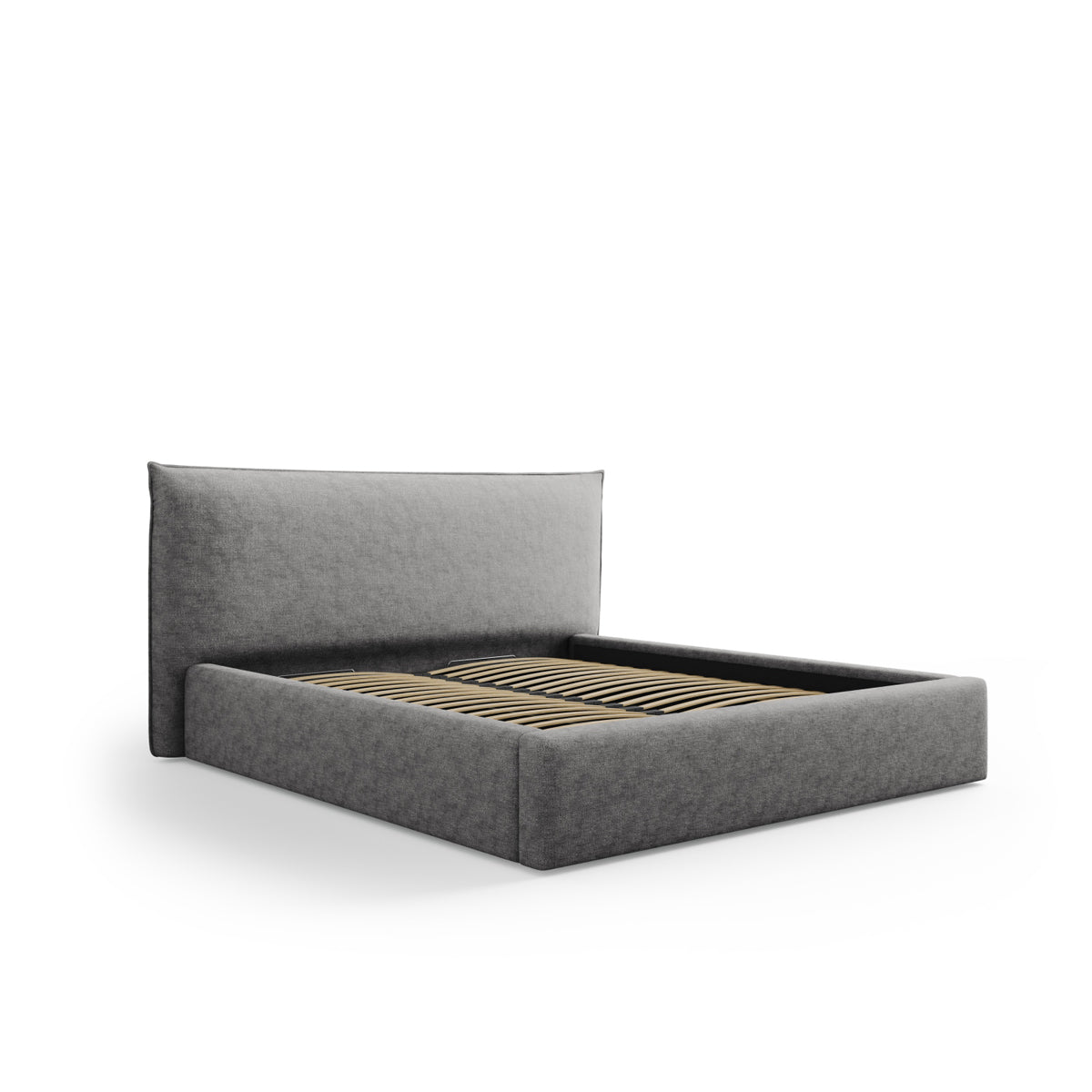 Pat tapițat în ţesatură de chenilă gri argintiu, cu tăblie și ladă de depozitare.