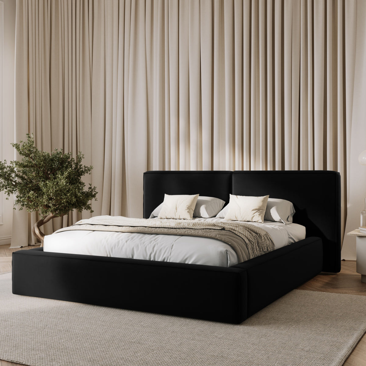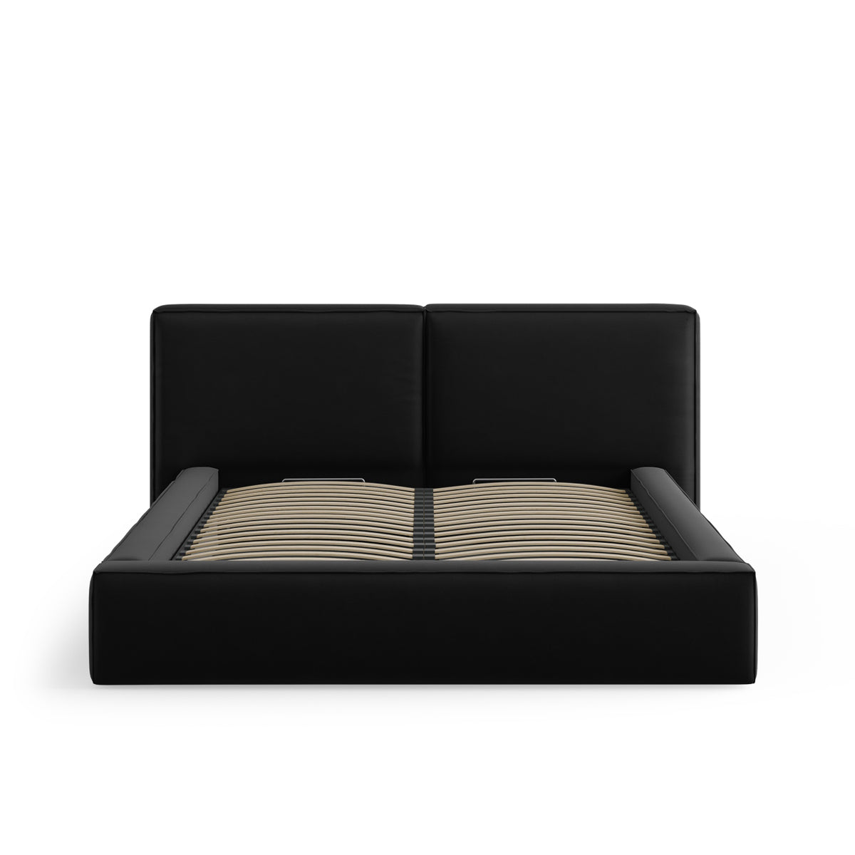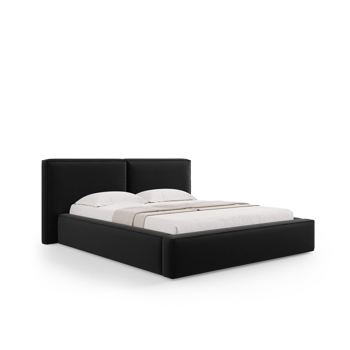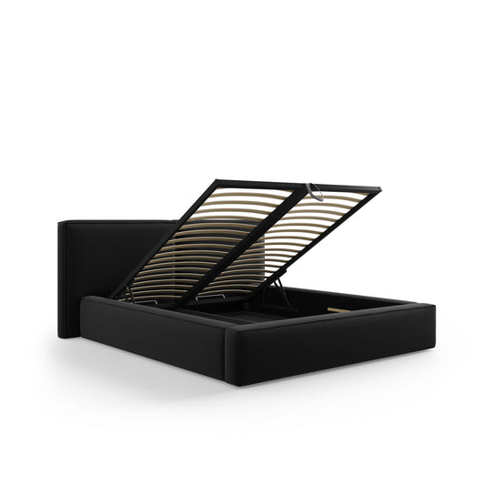 Pat tapițat în catifea neagră, cu tăblie și ladă de depozitare.