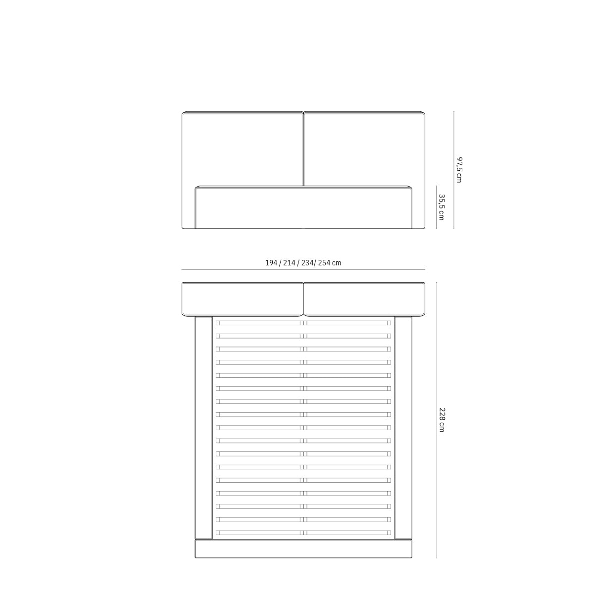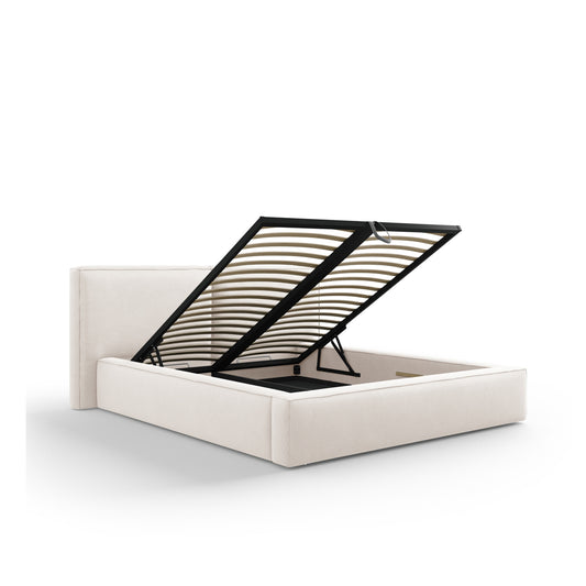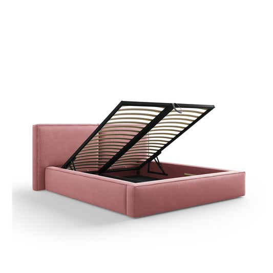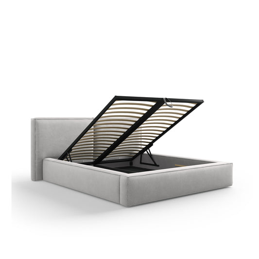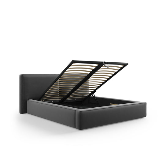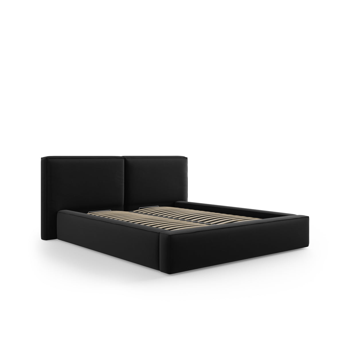 Pat tapițat în catifea neagră, cu tăblie și ladă de depozitare.