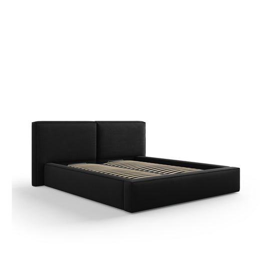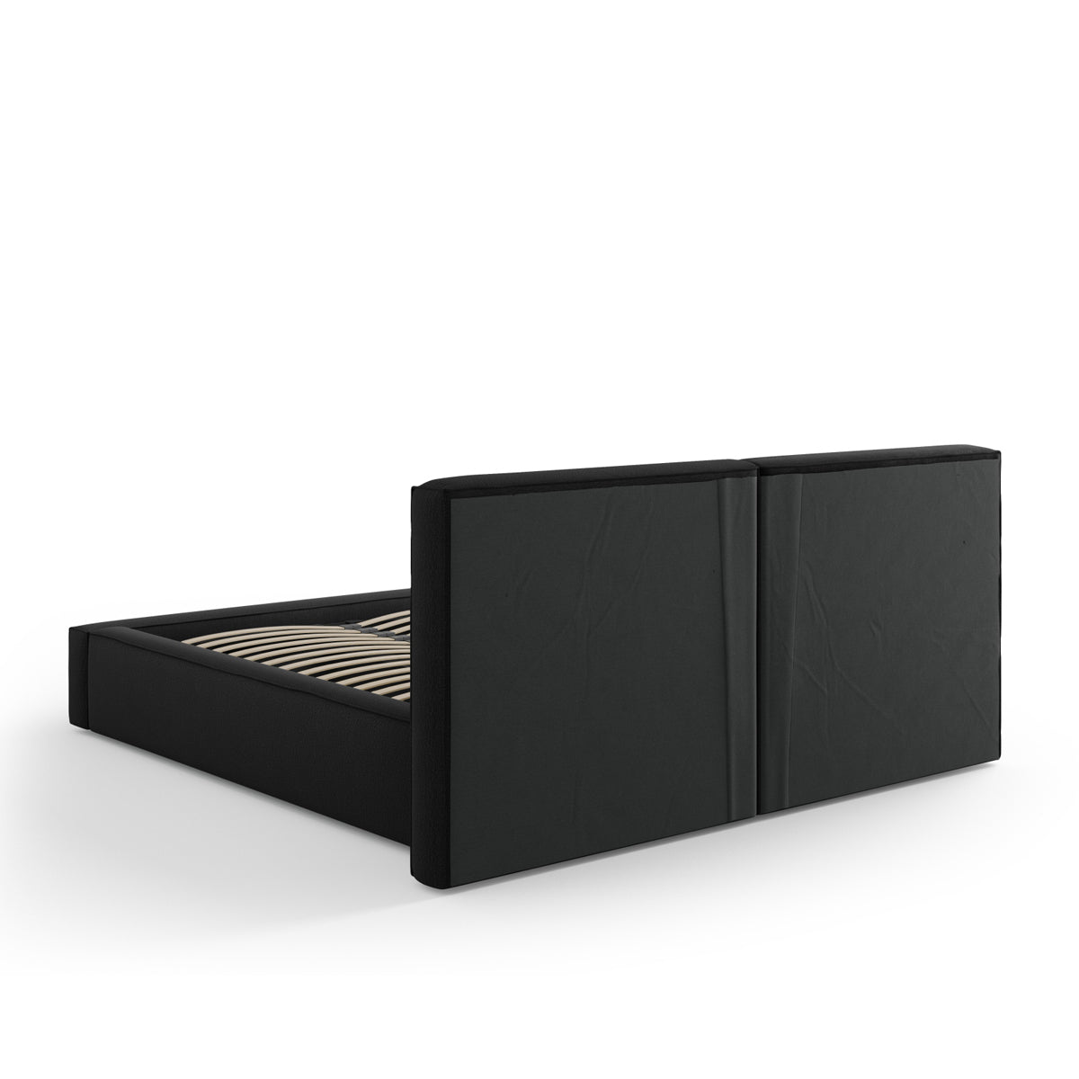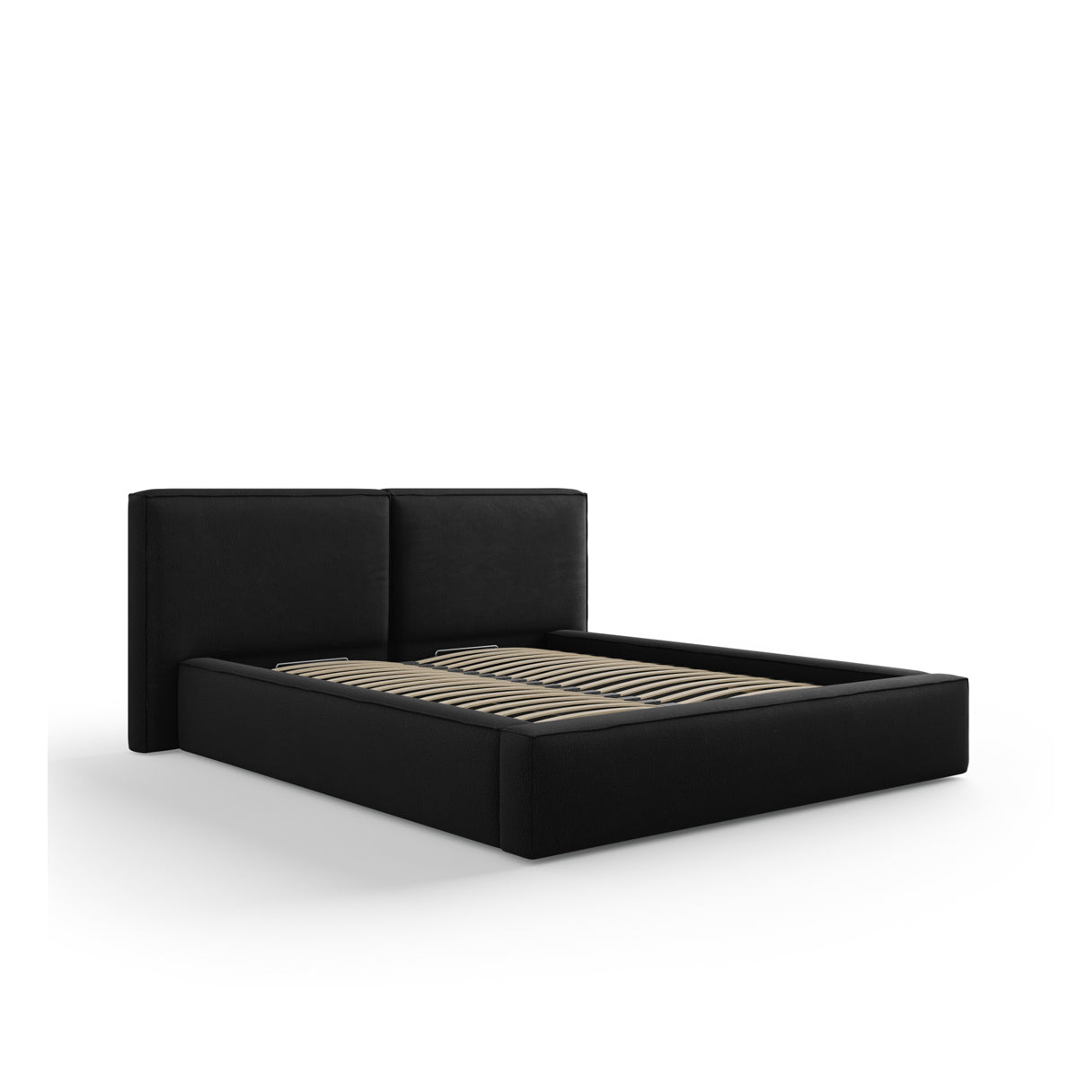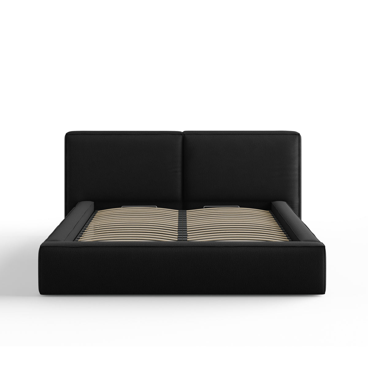 Pat tapițat în ţesatură structurată neagră, cu tăblie și ladă de depozitare.