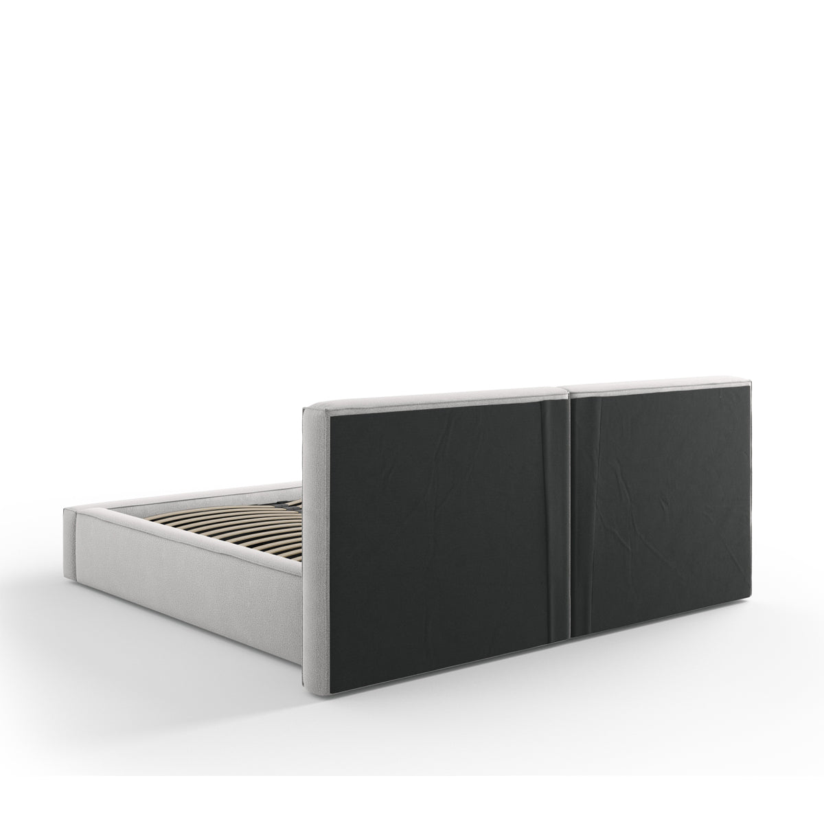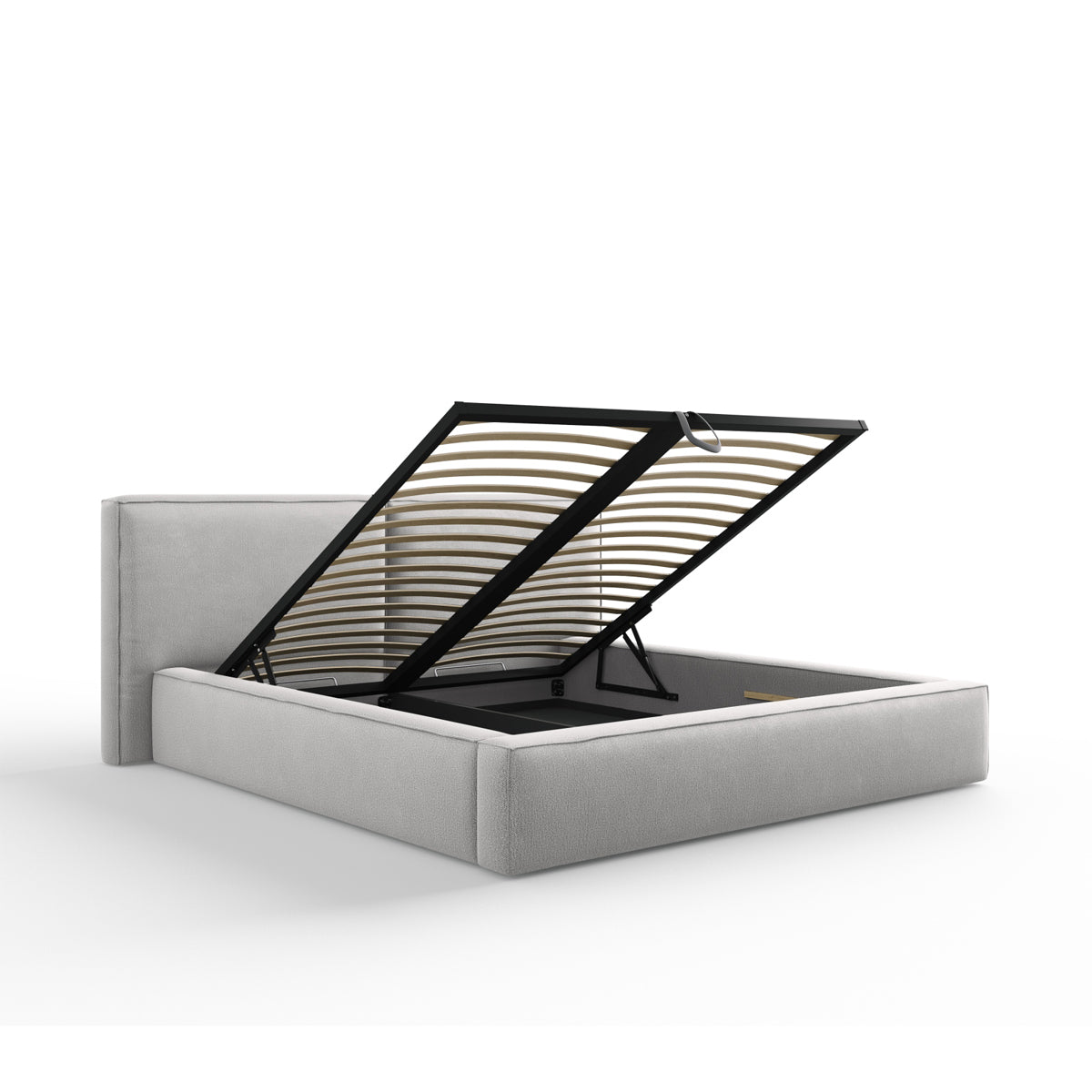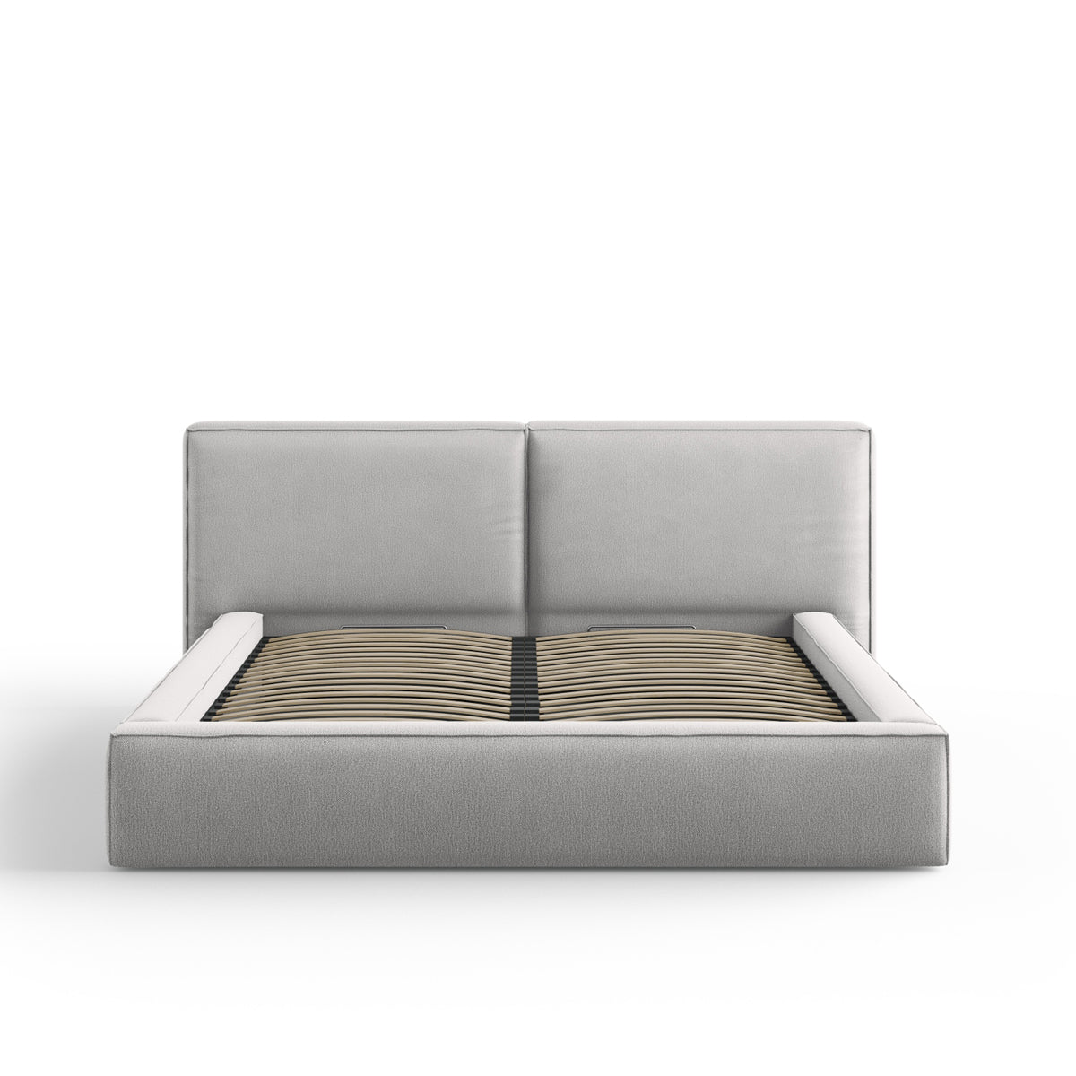 Pat tapițat în ţesatură structurată gri deschis, cu tăblie și ladă de depozitare.