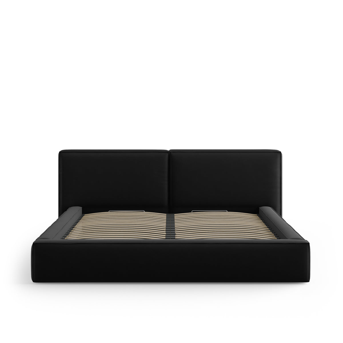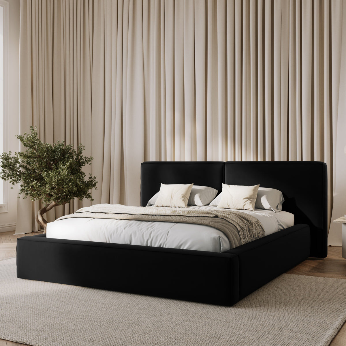 Pat tapițat în catifea neagră, cu tăblie și ladă de depozitare.