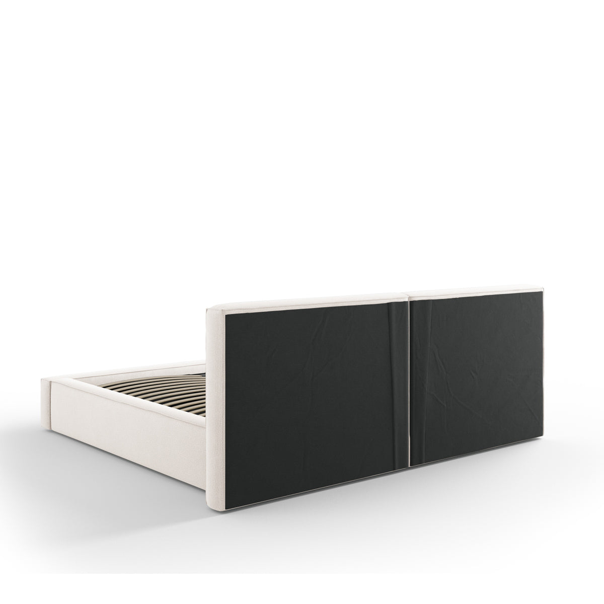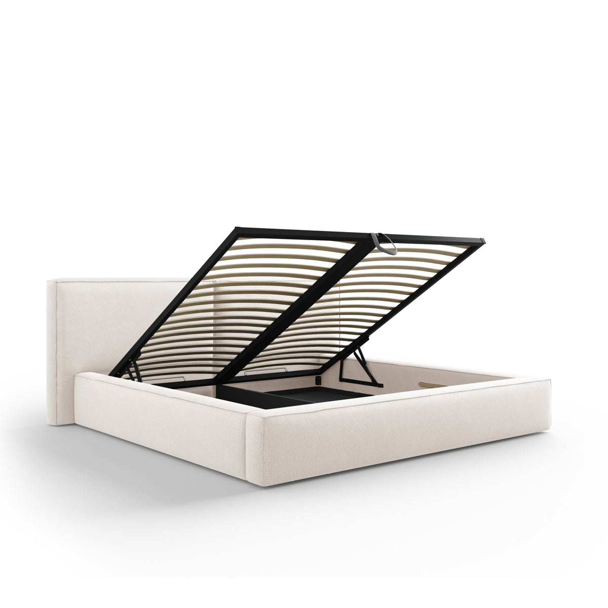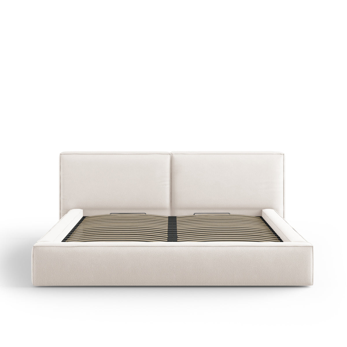 Pat tapițat în ţesatură structurată bej deschis, cu tăblie și ladă de depozitare.